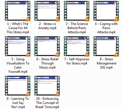 | Video I: What’s the Cause for Stress? How Can I Avoid Fueling It?Video II: Stress Vs Anxiety – The Inside ScoopVideo III: The Science Behind Panic AttacksVideo IV: Coping With Panic AttacksVideo V: Using Visualization to Calm YourselfVideo VI: Stress Relief Through MusicVideo VII: Self-Hypnosis For Stress ReliefVideo VIII: Stress Management 101Video IX: Learning To Just Say “NO!”Video X: Embracing The Concept of Break Time & Relaxation |